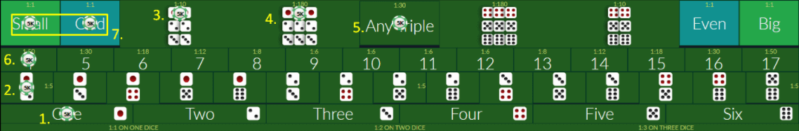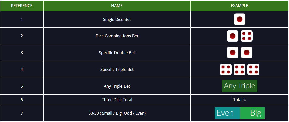 - Setelah waktu betting ditutup, dealer akan melempar dadu dan hasil yang muncul dari 3 buah dadu menjadi hasil permainan